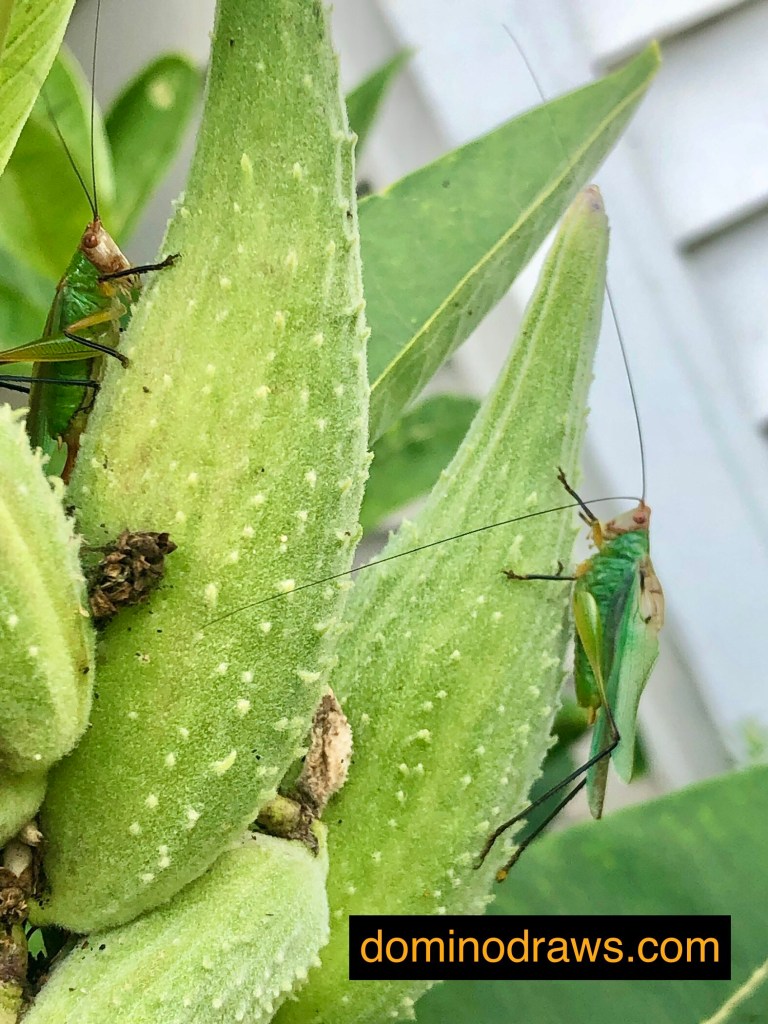 Two Black-legged meadow katydids aka Orchelimum nigripes. These guys have been hanging out in my milkweed plants lately. The individual on the right (male) was stridulating and lucky him, it looks like he managed to attract a female seen left.